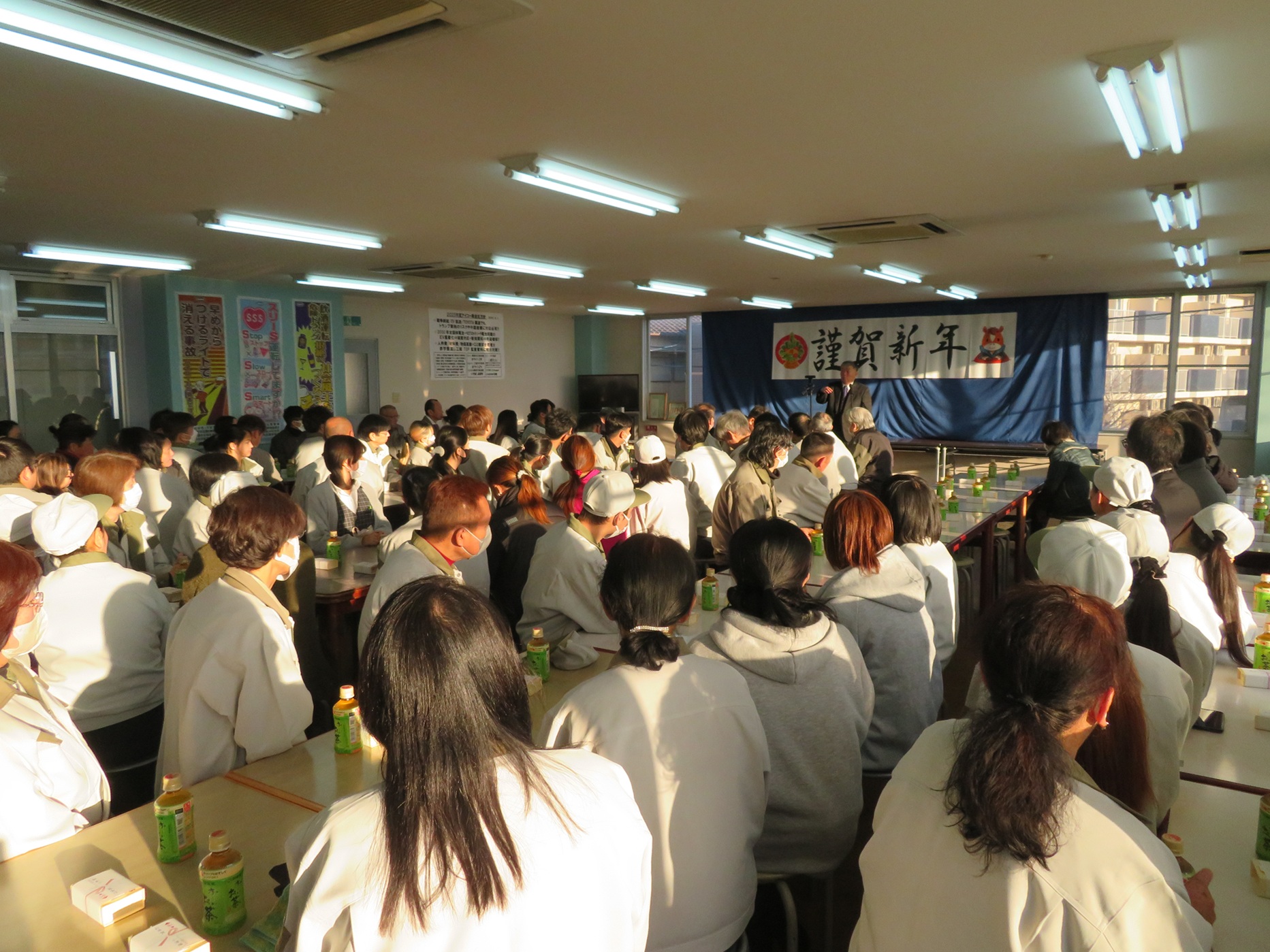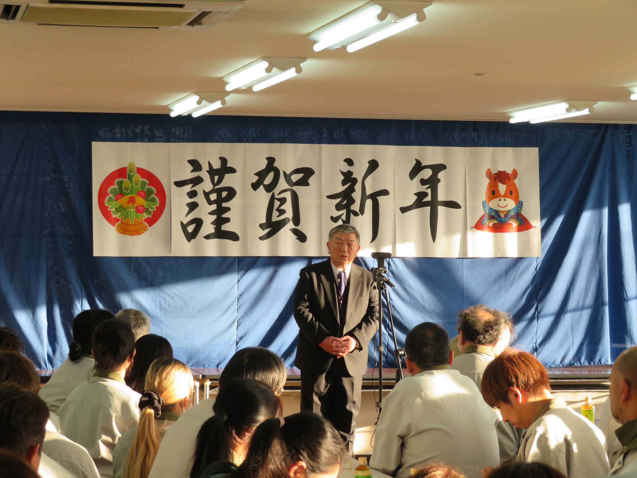 2026年1月6日、仕事始めに寿ぎの会を実施しました。社長や専務からアイコーを取り巻く日本や世界の情勢についての話を聞きながら、新たに全員で一丸となって1年間頑張ろうと決意しました。